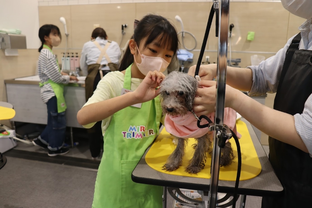 未来トリマーは、動物が好きな子供たちにトリマーという職業体験を通じて「命の大切さ、頑張ること、やってみること」など、心の成長と動物への接し方をレクチャーします。
