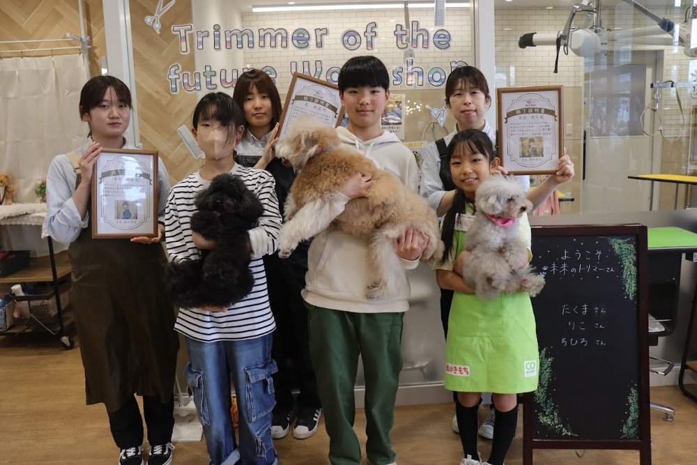 小さな命に直接触れ、温かさや柔らかさ、いとおしさを感じ、トリミングの意味を理解していく中で、命はかわいいだけでなく、人の手で守るべき存在であることを学んでもらうことを目的としており、参加いただいた子どもたちには、未来トリマー修了書を進呈しています。